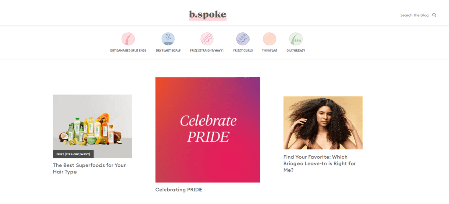 Haircare brand Briogeo uses its blog for all sorts of queries and tips within its niche, such as product promotion, DIY hair care, and helpful guides on discovering your hair type. It speaks on a lot of topics but makes sure to favor keywords in its market, from “healthy hair” to “itchy scalp” to promote the website across search engines.