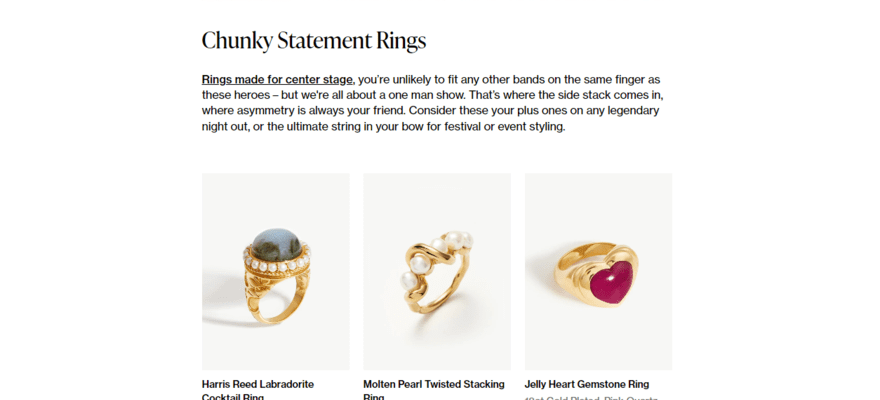 The content itself is readable and engaging, with links to featured products and multiple images to break up the text, helping to give customers a greater look into the jewelry’s design.